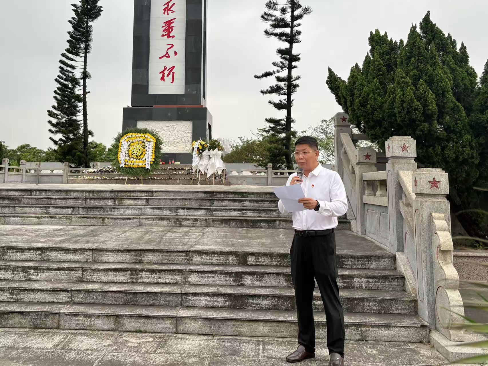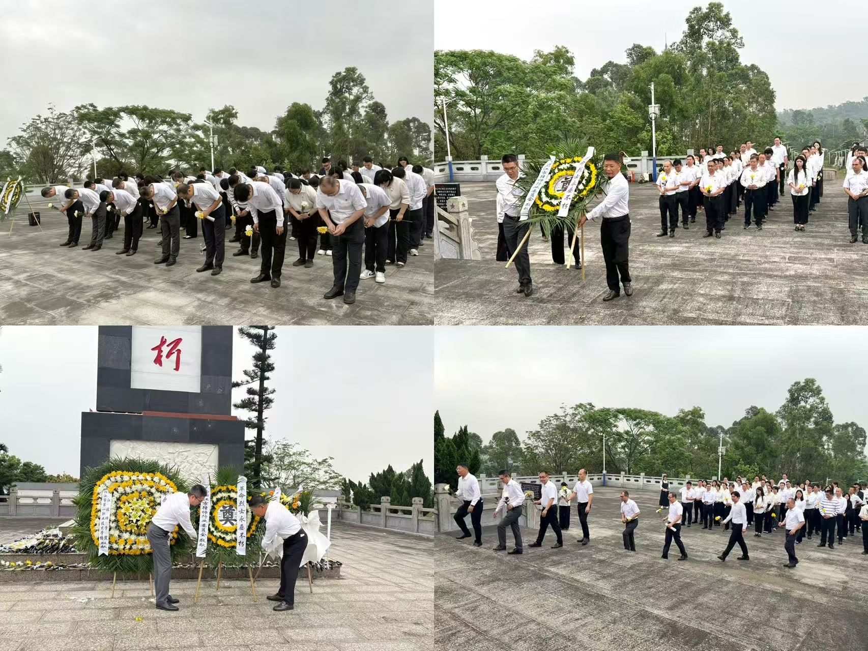 苍松翠柏掩映下的佛子岭庄严肃穆,阳江围歼战革命烈士纪念碑巍然耸立。纪念活动在雄壮的国歌声中正式开始,全体人员肃立默哀,向为解放漠阳大地献出宝贵生命的革命先烈致以最深切的哀思。黄嘉喜书记、曾仕记副书记代表全体人员向烈士纪念碑敬献花圈,缓步上前整理缎带。随后,全体人员面向纪念碑深深三鞠躬,并依次绕行瞻仰纪念碑,敬献手中鲜花,表达对英雄烈士的无限敬仰与怀念。